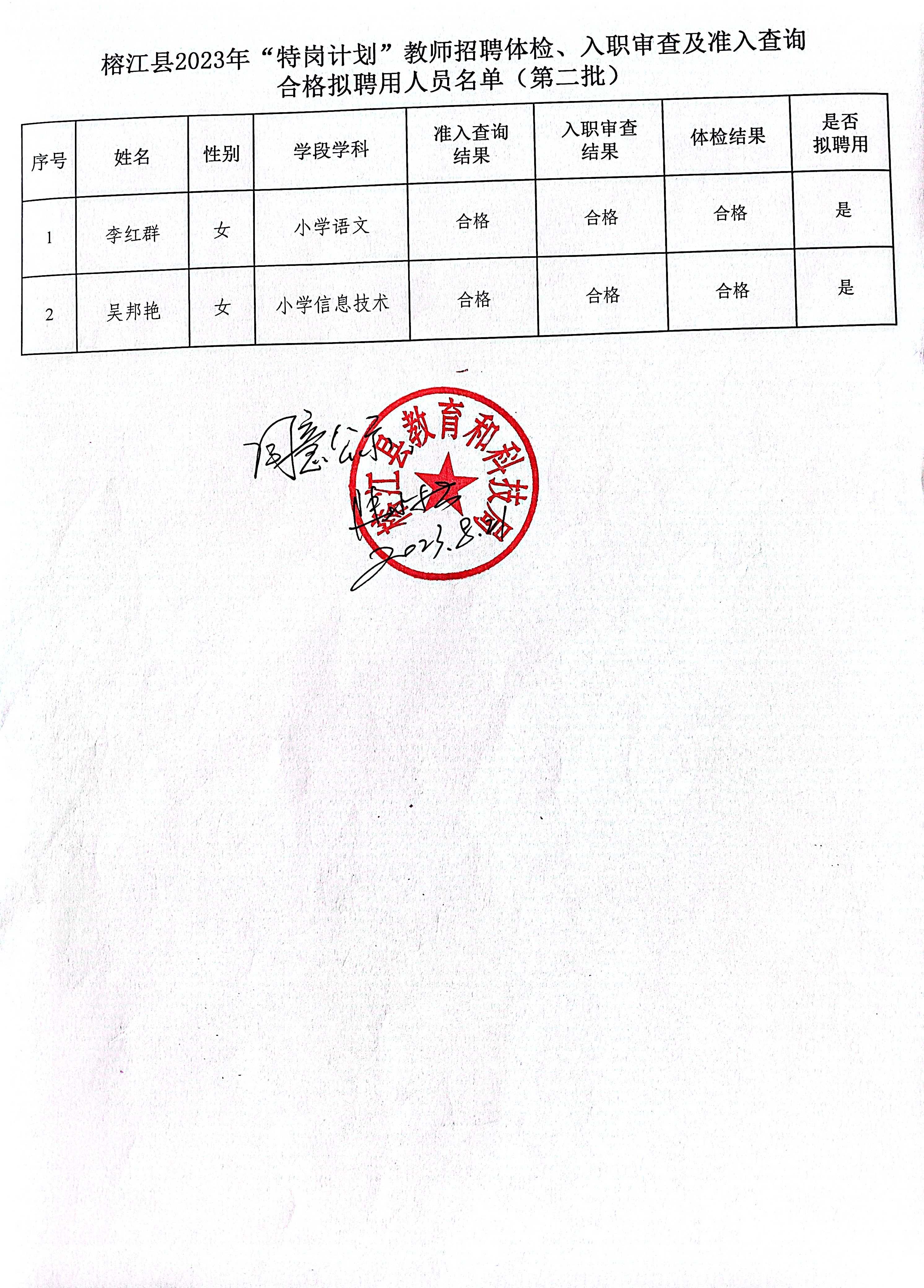原文標題:榕江縣2023年“特崗計劃“教師招聘體檢、入職審查及準入查詢合格擬聘用人員名單公示(第二批2人)